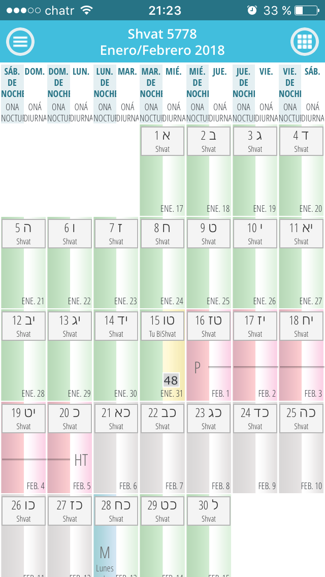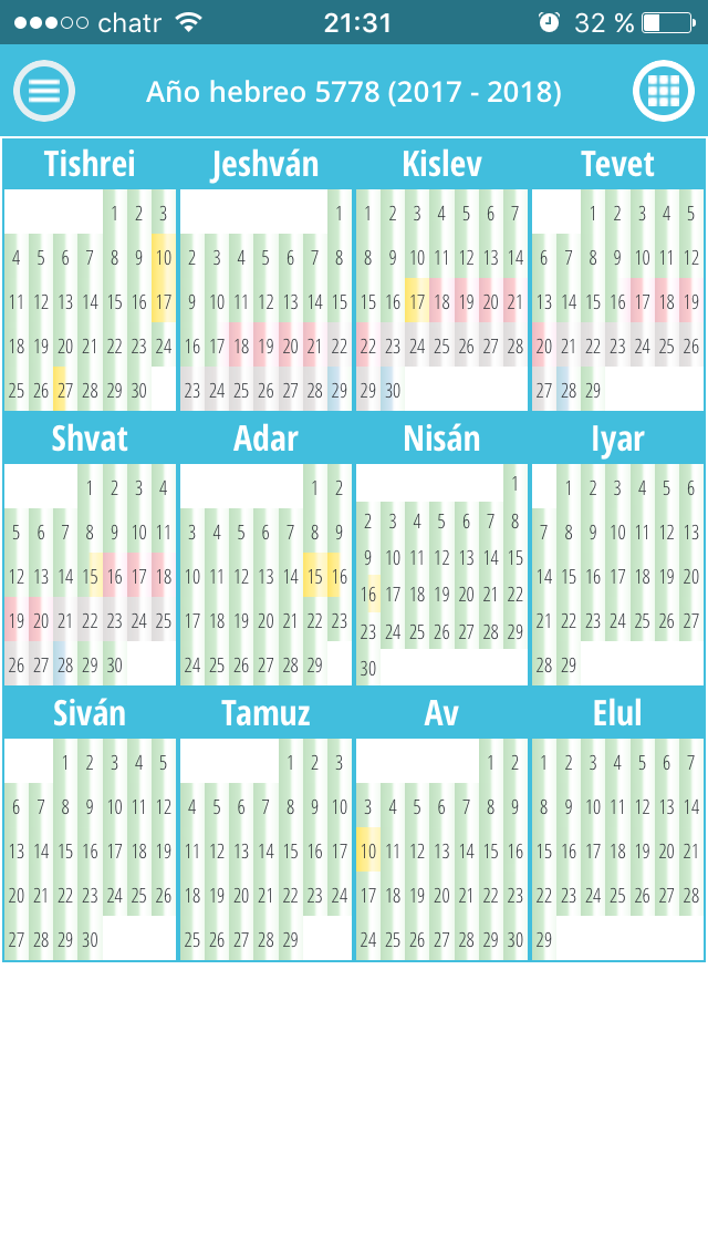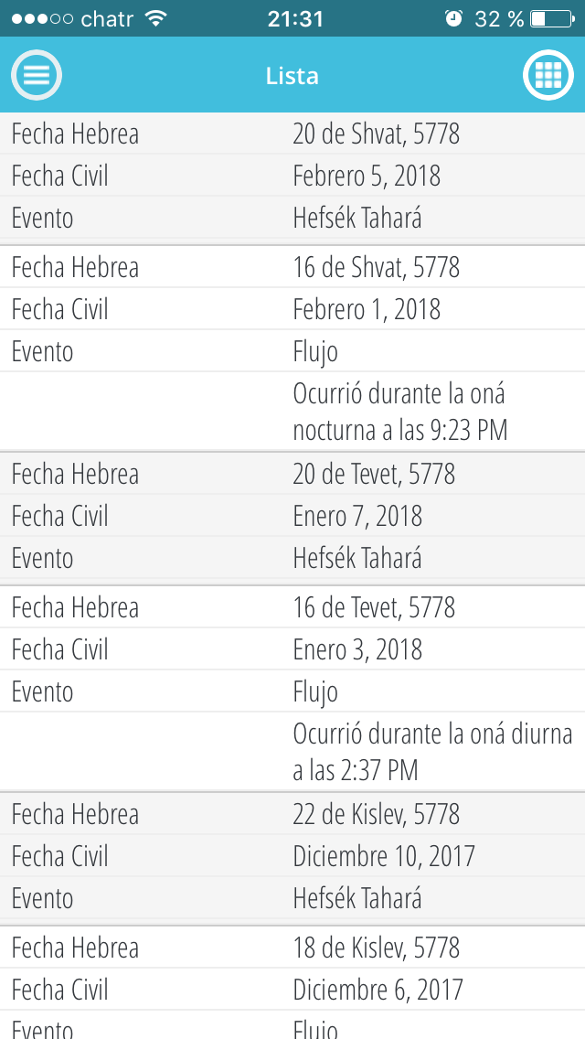 La Halajá (ley judía) oredena usar un calendario hebreo para calcular los tiempos que demanden abstenerse de las relaciones maritales en prevención de un período menstrual. La fecha hebrea comienza con la shkiá (puesta del sol) y termina al día siguiente con la shkiá (mientras que la fecha civil, basada en el calendario solar estándar, comienza y concluye a medianoche). Todos los cálculos menstruales se estiman sólo de acuerdo al calendario hebreo. Los cálculos basados en cualquier otro calendario no serán precisos. Nunca uses un calendario solar éstandar con esta finalidad, aunque, como mera referencia, este calendario en línea incluye las fechas civiles.